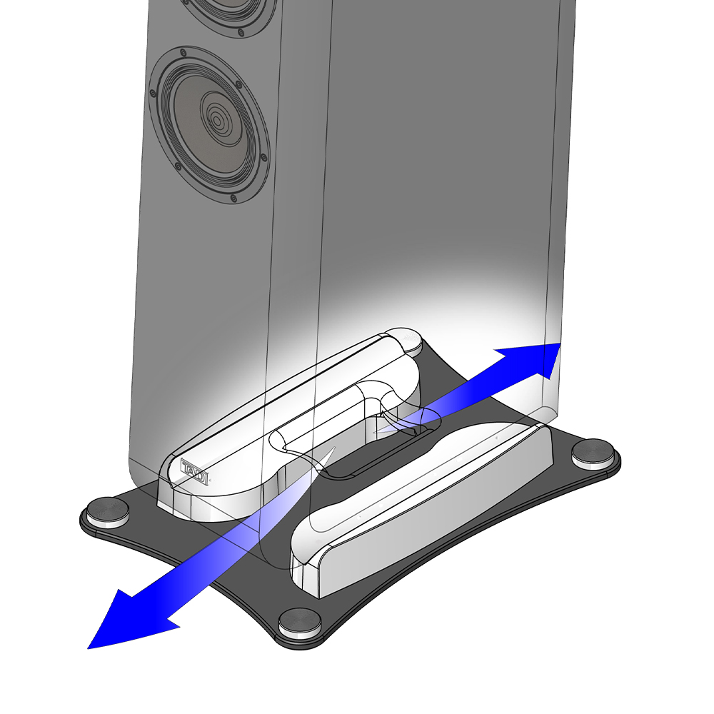 The Bidirectional ADP (Aero-Dynamic Port) System positions a port at the base of the enclosure, with its openings facing the front and rear. The port features a horn-shaped interior that reduces port noise and enhances efficiency in driving the port, resulting in clear and responsive sound in the mid-to-low frequency range. The combination of the port flare crafted from die-cast aluminum with the symmetrical front-back layout effectively counteracts the physical force that vibrates the enclosure, thereby contributing to the reproduction of powerful bass. Moreover, the 10 mm-thick machined steel base plate attached to the enclosure’s bottom enhances its stability when placed on the floor, counterbalancing the reaction caused by the powerful driving force of the twin woofers.